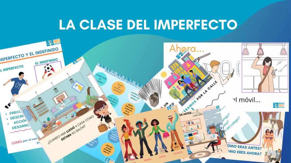 5 infografías con presentación y ejercicios sobre el imperfecto y 1 documento con las instrucciones para llevarlo a tu clase online o presenciales